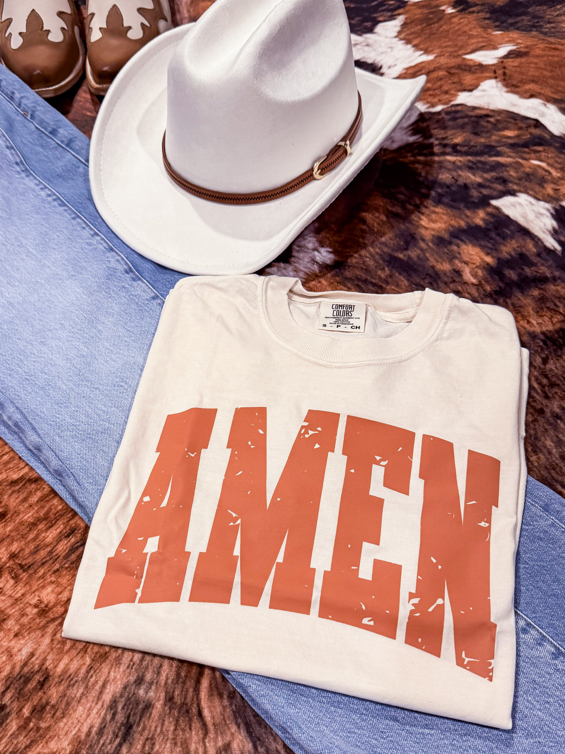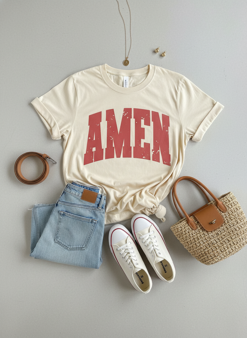 This bold tee features rustic red varsity-style lettering that makes a simple but powerful declaration of faith. Amen means “so be it”—a word spoken in agreement with God’s truth, His promises, and His goodness. It’s the final word of prayer, the voice of belief, and the response of a heart that trusts the Lord.