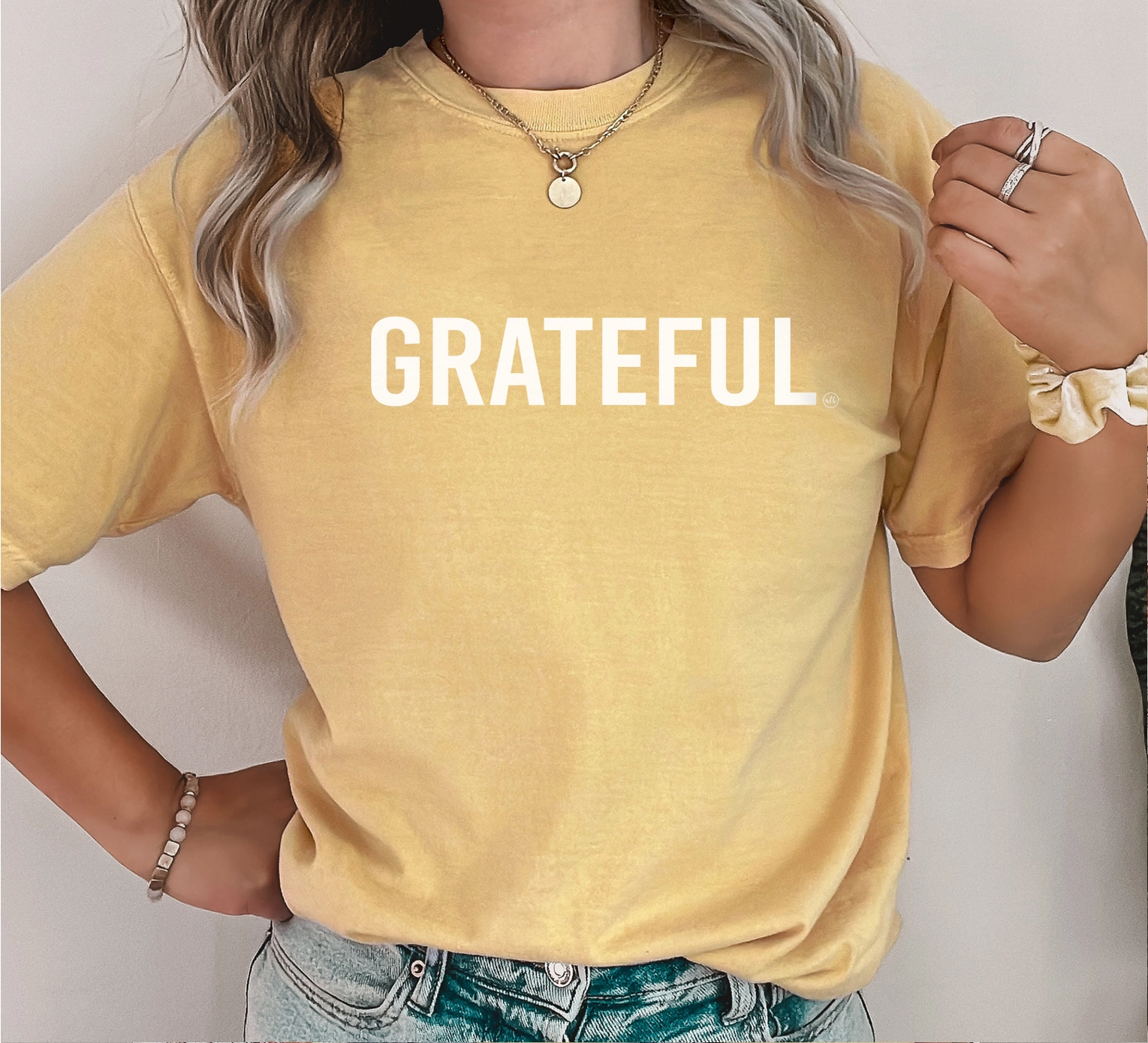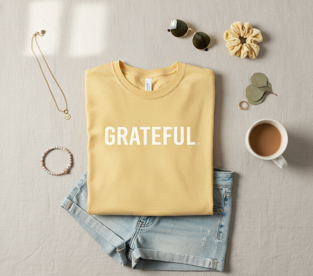 - Mustard yellow Comfort Colors tee with white “Grateful” print