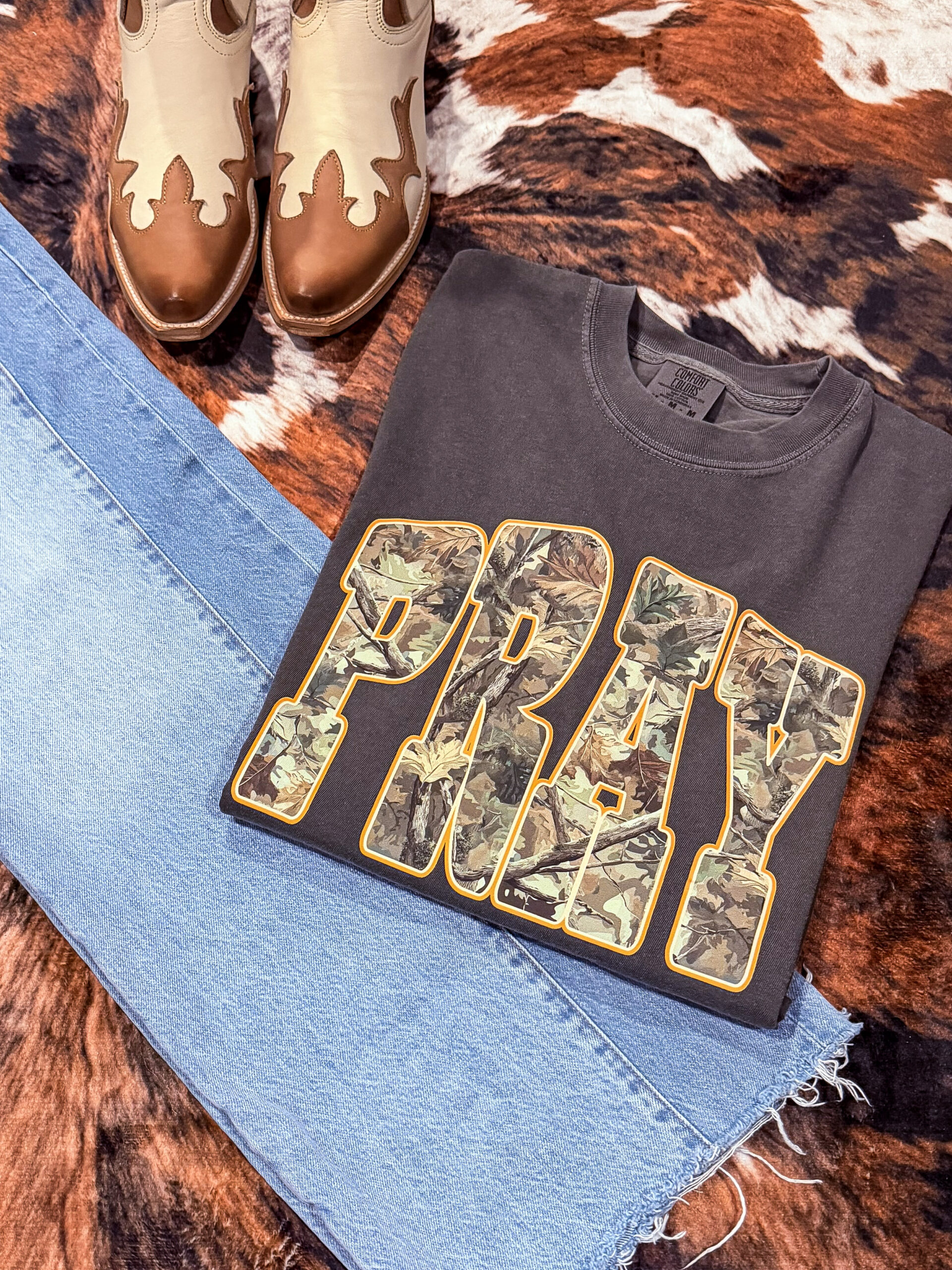 • Dark gray tee with bold varsity PRAY graphic in green leafy camo