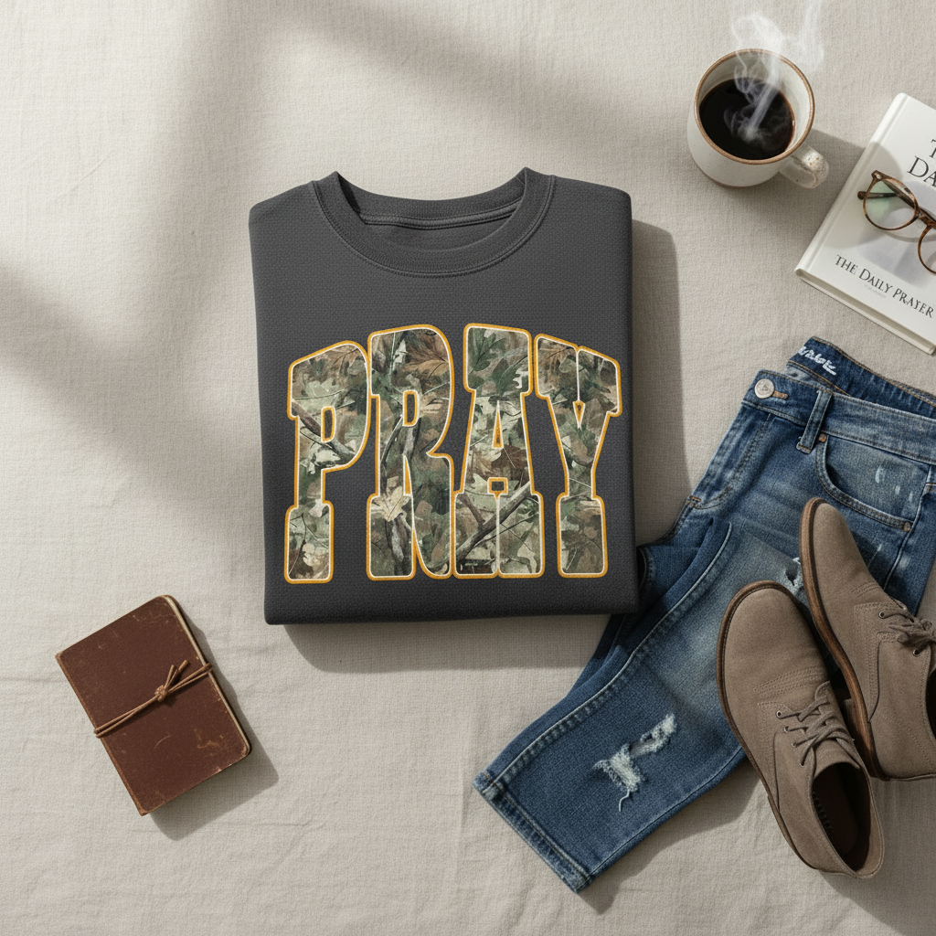 This powerful tee is a reminder that prayer isn’t passive—it’s spiritual strength. Featuring bold varsity-style lettering filled with rugged leafy camo, this design declares that prayer is how believers prepare for the real battles of life. When the world feels loud and uncertain, prayer keeps us grounded, focused, and connected to the One who is in control.